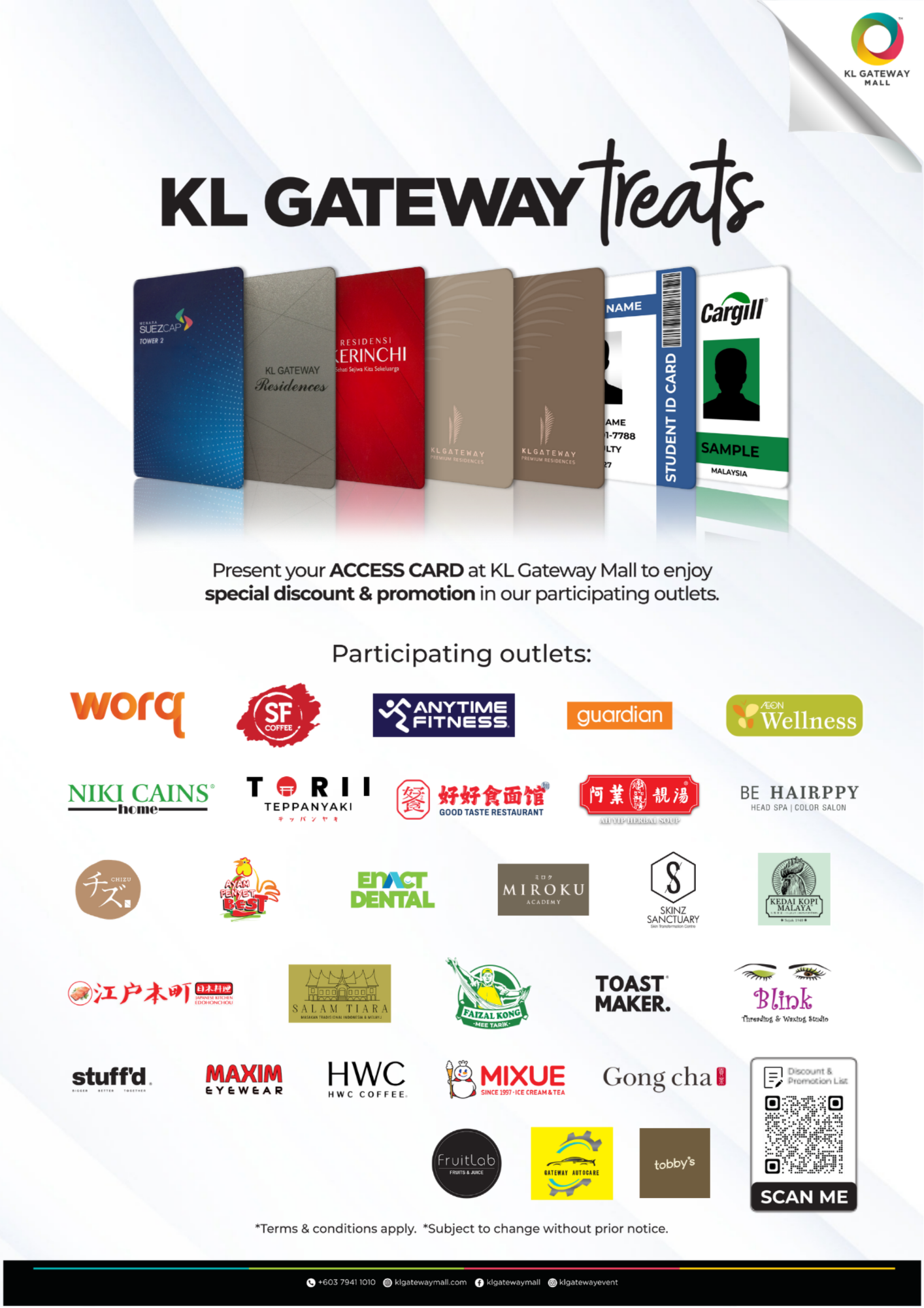 KL GATEWAY TREATS is an exclusive reward / promotion specially created for approximately 7,000 potential shoppers directly from KL Gateway office which inclusive of Menara SUEZCAP 1&2, Residensi Kerinchi 1 & 2 and KL Gateway Residences 1 & 2. These campaign is only available for SUEZIANS who present the Access Card to the outlet as below: